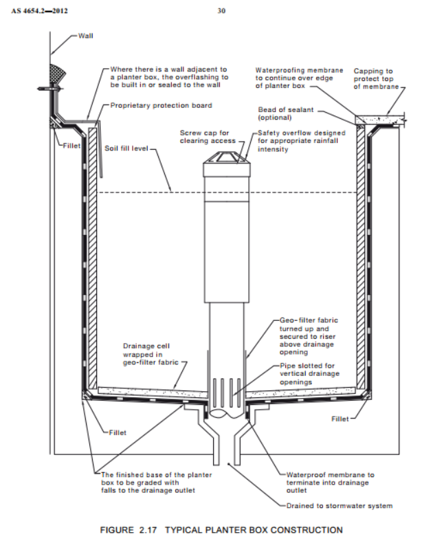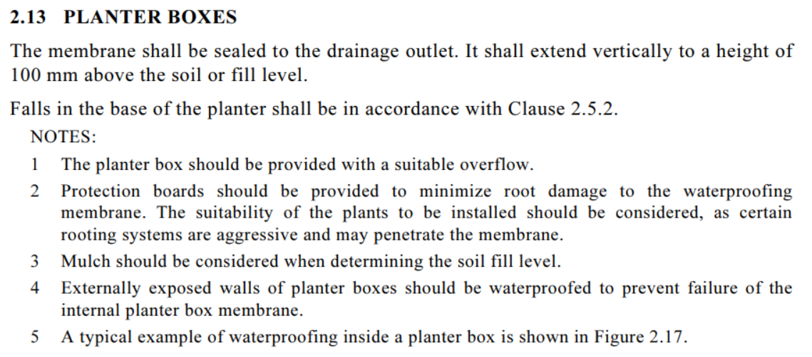 The excerpt below from AS4654.2-2012, Waterproofing for external above-ground use, also outlines important details regarding planter boxes to keep in mind.